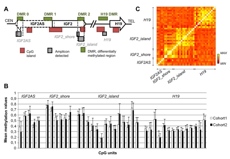 Considerable inter-individual variation in DNA methylation values was observed within each CpG unit. Within a single amplicon, DNA methylation values of the CpG units were strongly correlated with each others, while correlation values were lower between CpGs belonging to different amplicons (Figure 1C). Intermediate correlation levels were observed only between IGF2_island and IGF2_shore, as expected because of their adjacent chromosomal position.
