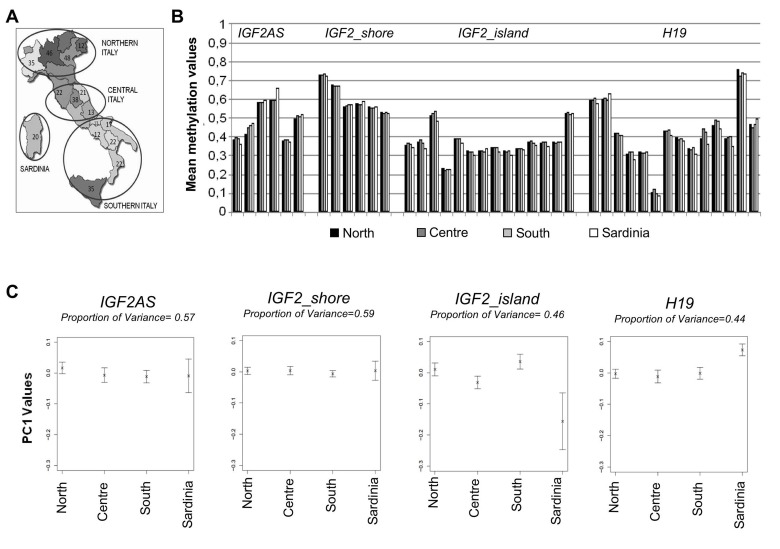 The Italian cohort comprises 376 middle-aged males (age range: 30-51 years) representative of the four main Italian geographical areas: Northern Italy (141 samples), Central Italy (94 samples), Southern Italy (121 samples) and Sardinia (20 samples) (Figure 2A). We evaluated if the observed variability in methylation levels of the IGF2/H19locus could be explained by ancestry and place of living of the four populations studied.