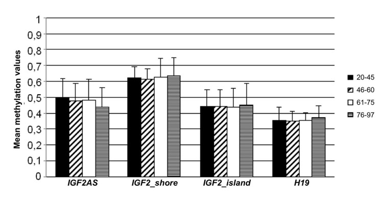 Our results indicate that the 4 analyzed regions in the IGF2/H19 locus show high inter-individual variability both in cohort 1 (spatial/population dimension) and in cohort 2 (temporal/aging dimension). IGF2AS and H19 have mean methylation values comparable to previous reports [16,17], indicating that methylation profiles are consistent among different populations and that the experimental technique used for methylation analysis is highly reproducible between independent laboratories. On the contrary, IGF2_island and IGF2_shore were analyzed for their methylation values here for the first time.