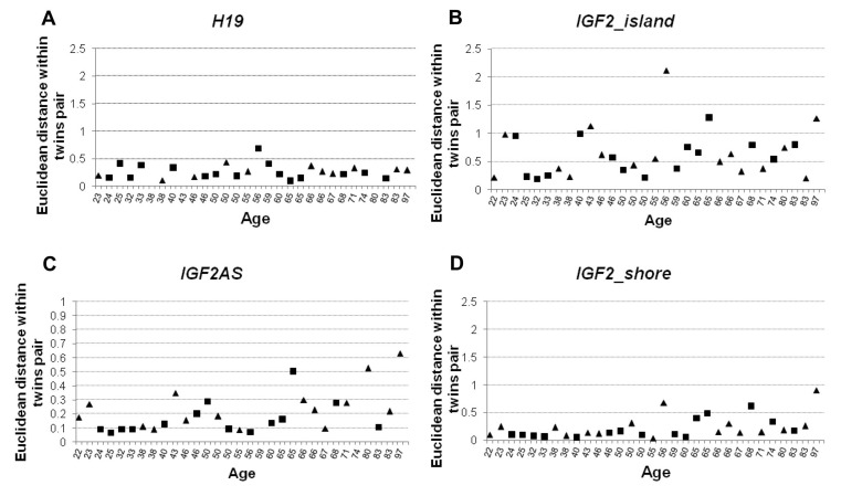 In order to estimate DNA methylation variability within the MZ twins couples, Pearson's correlation and Euclidean distance values for each twins pair were calculated. Pearson's correlation was calculated considering methylation values of each CpG from the same amplicon. The correlation values were then plotted against the age of the subjects (Figure 4). H19 was characterized by a high degree of within-twin pairs correlation (Figure 4A) which was maintained up to old ages (Spearman's correlation with age ρ= −0.094). IGF2_island also did not display variations of correlation levels with age (Spearman's correlation with age ρ = −0.105). However, in this case the intra-couple correlation scores were lower, indicating that high levels of variability characterize the CpG island of IGF2 (Figure 4B). Interestingly, both IGF2AS and IGF2_shore showed an age dependent trend (Spearman's correlation ρ = −0.613 and r = −0.651 respectively), with high correlation levels till the age of 50, followed by a progressive decrease of correlation in the couples of older age (Figure 4C-4D). A possible threshold between the age of 56 and 60 years can be envisaged, and after such age limit the values of intra-couple correlation levels are much more scattered.