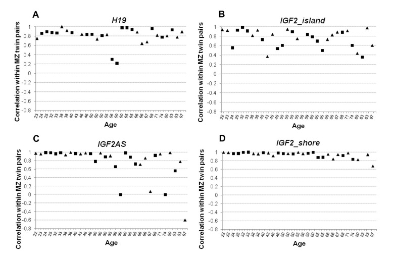 MZ twins model allowed the investigation of the maintenance of DNA methylation profiles during the lifespan. IGF2AS and IGF2_shore methylation levels were highly concordant within twin pairs, but only until the 60 years age threshold. Homogeneous methylation values in IGF2AS and IGF2_shore until the age of 60 years can be in part due to the genetic identity and the sharing of intrauterine and neonatal environments. It is interesting to observe that the threshold of 60 years coincides with the end or with the significant reduction of the reproductive capacity of individuals. A loss in molecular fidelity after the threshold of 60 years has been described [22]. This can affect also the DNA methylation machinery, impairing its ability to maintain the methylation patterns across cellular divisions [23]. The extent and the rate of this process can be influenced by the genetic background of subjects [24], accordingly in our cohort, a subset of couples maintains the concordance in DNA methylation profiles also at old age.