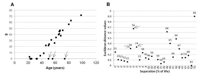 Low Euclidean distance levels characterized twins with small S values, while a scatter after the threshold ofS=35, which in our cohort corresponds to the age of 60, was observed (Figure 7B). There were 3 main exceptions, indicated with an arrow in Figure 7B. These subjects (aged 50, 56 and 74) were still living in the same house at the time of recruitment (small S values) but were characterized by high Euclidean distance values for IGF2_shore.