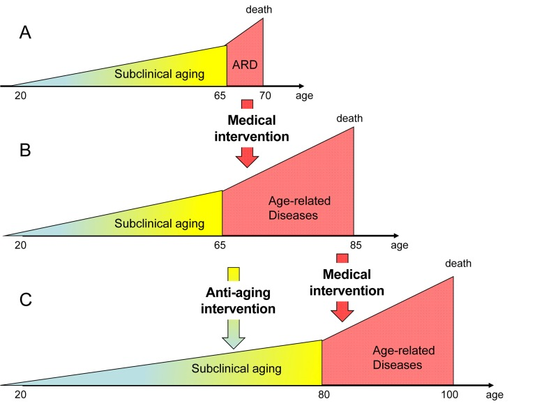 In the past, most people died (from incidents, infections, malnutrition and homicide) before they achieved the age of age-related diseases. For example, in the 17th century in London, only 25% of people survived until the age of 26 (see for references [7]). By the mid of 20th century civilization and medicine allowed most people to live long enough to die from aging or strictly speaking from age-related diseases (Figure 1A). Still until very recently people died soon after they reached the age of age-related diseases from the complications of these age-related diseases (Figure 1 A). Now effective medical interventions can keep a patient alive despite age-related diseases (Figure 1B). This increases the ratio of unhealthy to healthy population (Figure 1B). What is needed is to delay age-related diseases (Figure 1C). And by lucky co-incidence, this could be done right now, potentially preventing the health care crisis (see text).