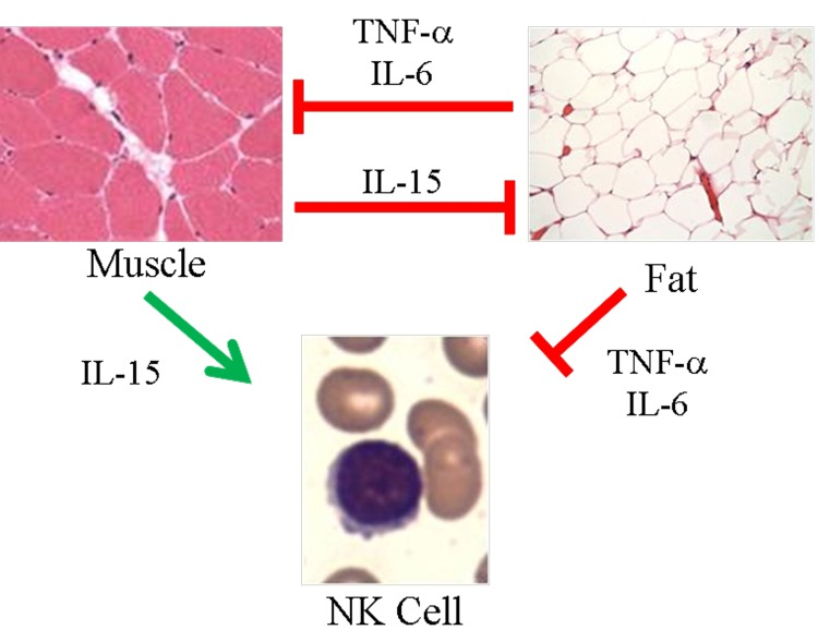 Below we review myokines that have been shown to affect NK cells, with special emphasis on IL-15. Declining muscle mass is expected to produce less IL-15, a myokine that regulates adipose tissue and promotes NK cell development and survival. Therefore, sarcopenia is expected to hinder NK cells.