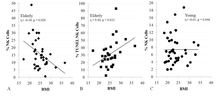 To relate sarcopenia, obesity, and declining immunity in aging, we speculated that these conditions are linked processes, which are controlled by adipose tissue-derived and skeletal muscle-derived cytokines, known as adipokines and myokines, respectively (Figure 1). As a preliminary exploration of this potential relationship, we studied body mass index (BMI) and NK cells in healthy young (median age 27) and elderly (median age >80) women. In the elderly cohort, BMI correlated inversely with percentage NK cells and correlated directly with NK cell apoptosis rate (Figure 2A, B). These relationships were not seen in young women (Figure 2C & not shown). As is typical for this age group, elderly subjects had a relatively high percentage NK cells among blood mononuclear cells, which is due both to higher NK cell number and to lower numbers of other blood lymphocytes. This may be a protective mechanism in the elderly when other leukocyte functions decline [17-19]. Our data suggest that the relative increase in NK cells with aging is blunted by obesity.