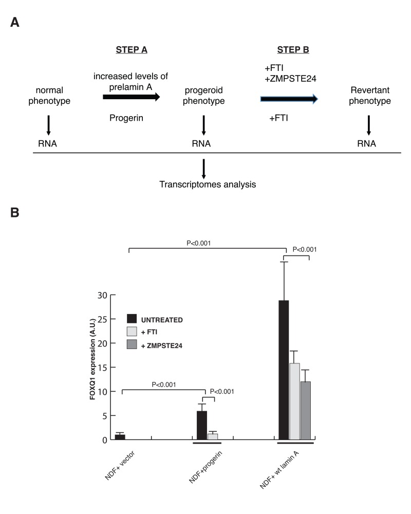 Here, we implemented a stringent screen to identify genes whose altered expression could contribute to the onset of the defective phenotypes induced by dysfunctional prelamin A processing. To this end, we compared the transcriptome of isogenic fibroblasts expressing either the mutant form of lamin A associated with progeria (termed progerin) or elevated levels of wild-type prelamin A, with that of wild-type fibroblasts. We subsequently used the reversion of two phenotypes, cell proliferation and nuclear membrane morphology, towards normal by treatment with farnesyltransferase inhibitors (FTI) and ZMPSTE24 overexpression as a filtering strategy to identify key downstream effectors. This analysis identified FOXQ1, a subtelomeric gene that encodes for a forkhead transcription factor, as the only statistically significant gene whose expression is induced in both cells expressing progerin and cells with elevated levels of wild-type prelamin A, subsequently reduced in both cell types upon treatment with FTI as well as in cells expressing elevated levels of lamin A after ZMPSTE24 overexpression. Strikingly, ectopic expression of FOXQ1 in normal human fibroblasts leads to the development of both features that were used in the filtering strategy (growth defects and alterations in nuclear membrane morphology) in a qualitative and quantitative manner similar to that observed in cells with dysfunctional prelamin A processing. However, we did not observe a significant improvement in growth nor nuclear membrane morphology in progerin-expressing cells after downregulation of FOXQ1 by siRNAs (data not shown), suggesting that altered expression of additional genes contributes to the maintenance of these phenotypes.