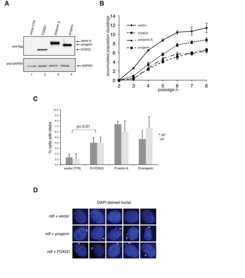 To define the functional link between FOXQ1 and the development of progeroid features induced by dysfunctional prelamin A processing, we overexpressed FOXQ1 in normal human diploid fibroblasts and monitored both growth and nuclear morphology of cells in culture over several passages (Figure 2). Strikingly, we noted that increased expression of FOXQ1 is accompanied by reduced rates of proliferation and by a significant number of cells with dysmorphic nuclei after a few passages compared to control cells (Figure 2B-D). Importantly, these changes are qualitatively and quantitatively similar to those observed in progeria cells, cells ectopically expressing progerin and cells with elevated levels of prelamin A (Figure 2) [11]. Growth inhibition is restricted to primary cells, since expression of FOXQ1 as well as progerin does not affect growth of transformed cells including HeLa and HEK293 (data not shown). The presence of nuclear blebbing in cells over-expressing FOXQ1 is remarkable, as this is a prominent feature of cells with altered lamin A function [19].
