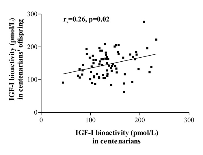 In a subpopulation of 76 centenarian parents and their corresponding 76 offspring, IGF-I bioactivity levels showed a significant positive correlation between parent-offspring pairs (r=0.26, p=0.02, Figure 1). No significant associations were found for other IGF/insulin system parameters in parent-offspring pairs.