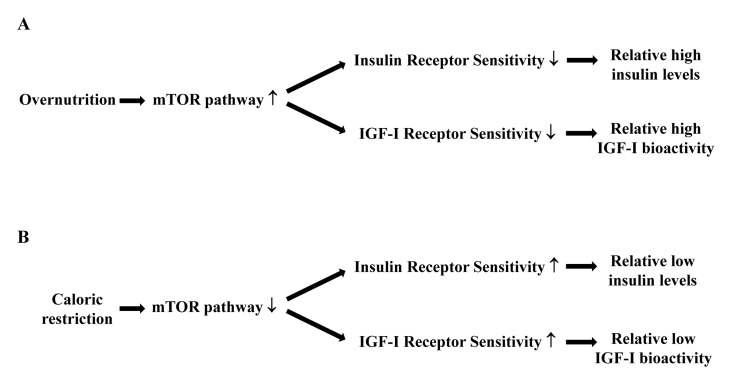 A target of rapamycin (mTOR)-centered model may further help to explain why the combination of relatively low IGF-I bioactivity and insulin levels with relatively high insulin responsiveness during caloric restriction is associated with good health and longevity. The mTOR pathway is involved in cellular senescence, aging and age-related diseases [44-46]. Normally the mTOR pathway is activated by numerous signals, including nutrients, IGF-I and insulin [44]. When the mTOR pathway is hyperactivated by overnutrition, it blocks the insulin action on glucose metabolism (Figure 2A). Insulin resistance results in elevated glucose levels and a compensatory insulin increase which will further deteriorate insulin sensitivity. Therefore it has been suggested that overnutrition induces insulin resistance, associated with accelerated aging and a shorter lifespan, through the hyper-activation of the mTOR pathway [44-46]. In contrast, caloric restriction deactivates the mTOR pathway (Figure 2B). This induces an improved insulin sensitivity and relatively low insulin levels and IGF-I bioactivity. Considering that insulin resistance plays a crucial role in determining several age-related diseases, it is reasonable to hypothesize that many of the anti-aging effects of caloric restriction are probably modulated by these pathways [44-46].