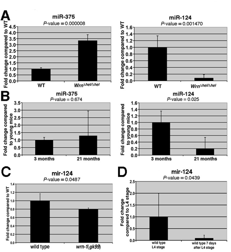 The quantitative measure of selected miRNA expressions was performed with TaqMan MicroRNA assays on extracted total RNA from four different WrnDhel/Dhelmutant and four wild type mice or on extracted total RNA from four young (three months) and four old (21 months) wild type mice following manufacturer's protocol (Life Techonology, USA).