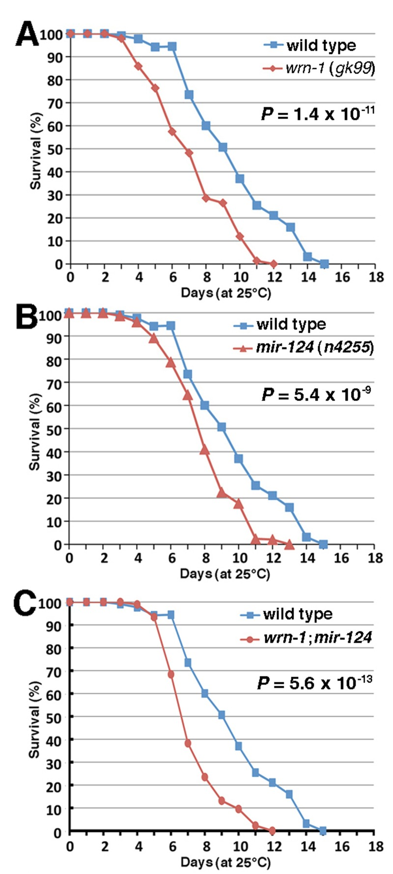 To assess the impact of the loss of miR-124 on aging, we measured the life span of worms carrying a deletion of themir-124 gene (mir-124(n4255)) [33]. As shown in Figure 2B, the median life span of mir-124(n4255) worms was significantly decreased by 15% (7.7 days versus 9.0 days) compared to the wild type animals (log-rank test: P = 5.4 × 10−9). Notably, animals carrying both deletion of mir-124 and wrn-1 genes (wrn-1;mir-124 animals) displayed a more severe decrease in their life span (48% decrease compared to wild type; log-rank test: P = 5.6 × 10−13) than the single loss of either gene (Figure 2C). These results indicate that both genes are important in the life span of C. elegans.