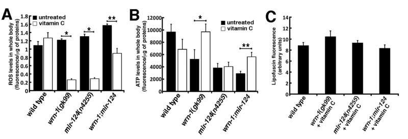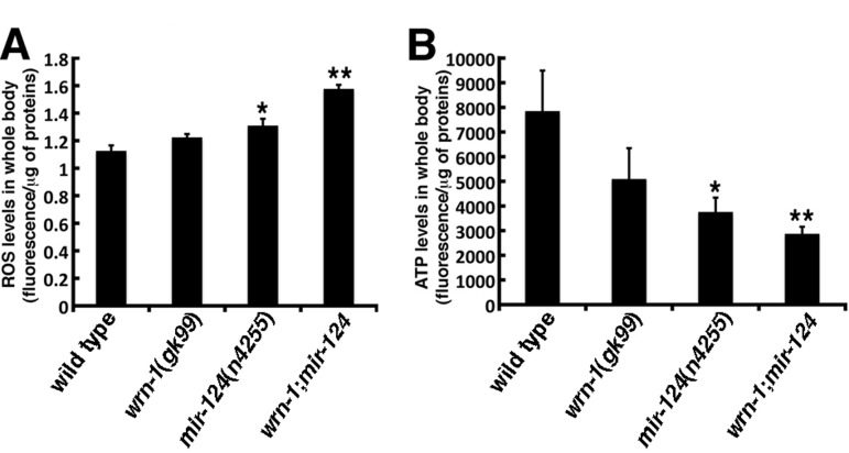 The loss of wrn-1 and mir-124 leads to an increase in reactive oxygen species (ROS) generation and a reduction in ATP levels