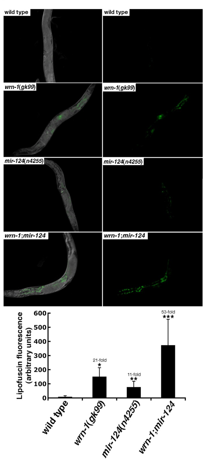 The loss of wrn-1 and mir-124 lead to an increase of the aging marker lipofuscin