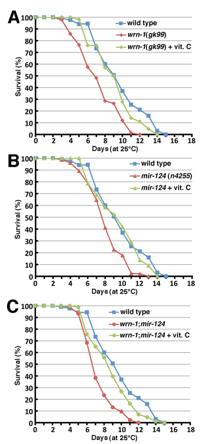 Vitamin C restores the normal life span of wrn-1(gk99) and mir-124(n4255) mutant strains