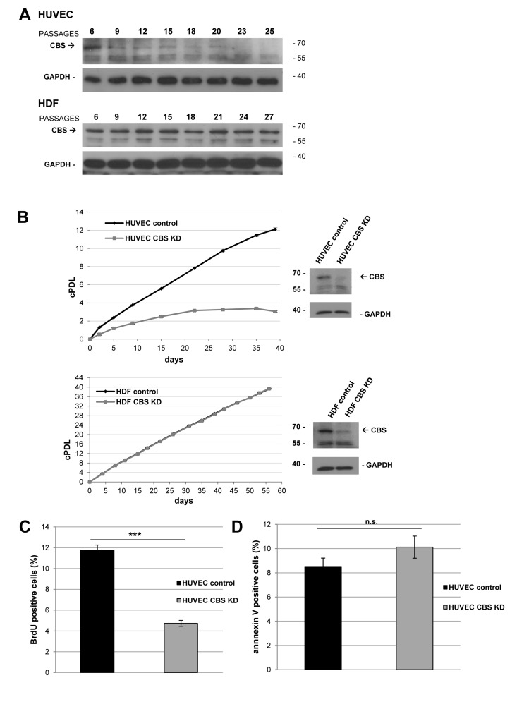 In the present communication, we observed that expression of cystathionine beta synthase (CBS) declined with serial passaging in human endothelial cells but not in other cell types. We also demonstrated that gene silencing of CBS by shRNA induced premature senescence, whereas senescence could be postponed by CBS overexpression in normal human endothelial cells. We also addressed potential mechanisms by which CBS affects the senescence phenotype. On the one hand, CBS knockdown induced mild respiratory uncoupling and reduced mitochondrial membrane potential. On the other hand, CBS knockdown increased the vulnerability of human endothelial cells to homocysteine, a well-known inducer of cellular senescence, which was described by others as risk factor predisposing to endothelial dysfunction and disease [11-13].