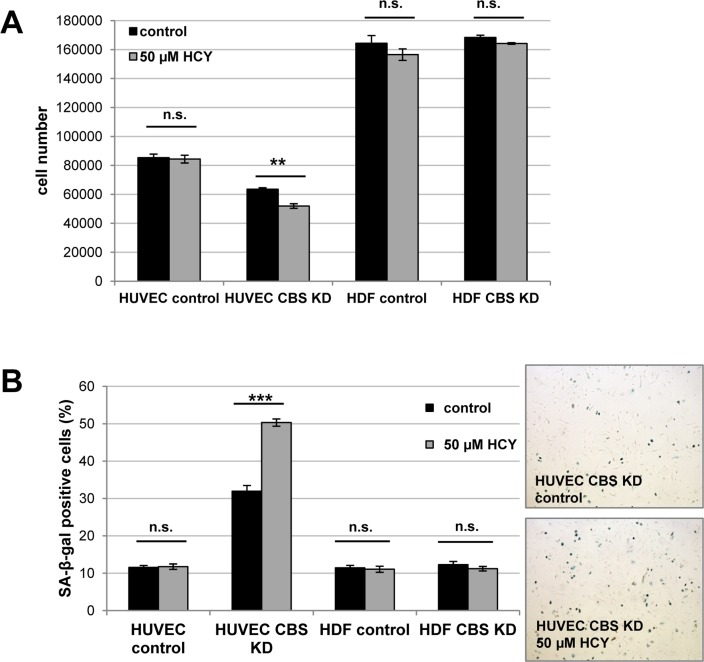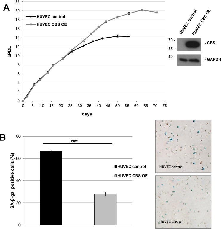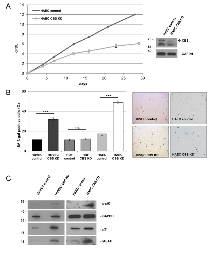 Previous data reported by us [4] and by others [5] have suggested that the transsulfuration pathway impacts on the rate of aging, probably by regulating intracellular availability of methionine. Importantly, deletion of CBS in yeast was shown to extend chronological lifespan [4], whereas in fruit flies, lifespan extension required CBS overexpression instead [5]. The role of CBS in lifespan regulation in mammals is currently unknown, although experiments with CBS−/− mice clearly established that homozygous deletion of the CBS gene results in a severe disease phenotype with drastically shortened lifespan and healthspan [18]. In patients, CBS deficiency results in the accumulation of homocysteine in the serum [11, 13]. Severe homocysteinemia was also observed in mouse models for CBS deficiency; whereas CBS−/− mice die a few weeks after birth [18], CBS −/+ mice were established as a model for CBS deficiency. Increased serum levels of homocysteine induce damage to endothelial cells in CBS −/+ mice [19] and in human patients with homocysteinemia [11]. Accordingly, elevated plasma total homocysteine is a risk factor for vascular disease [11], and premature arteriosclerosis [9]. It has been hypothesized that senescence of endothelial cells in the vessel wall contributes to vascular aging and disease [6]. In this communication, we show that CBS deficiency induces endothelial cell senescence in vitro, involving both mitochondrial dysfunction and increased vulnerability of the cells to exogenous homocysteine, suggesting a new mechanism linking CBS deficiency to vascular aging and disease.
