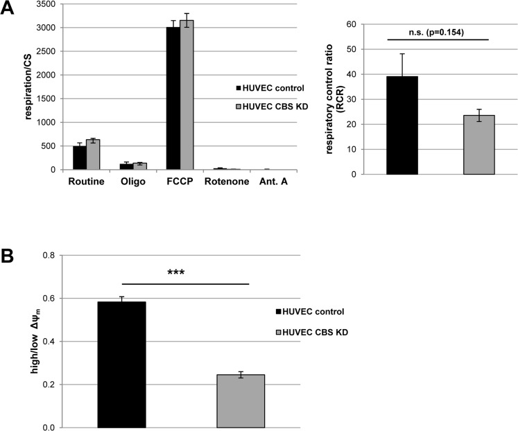 From studies in model organisms, it is known that methionine restriction increases lifespan via alterations of mitochondrial function [1]. Since CBS knockdown can be considered as a genetic condition to increase methionine concentration, we addressed the question if CBS knockdown would affect mitochondrial function. Whereas depletion of CBS did not significantly influence oxygen consumption, the respiratory control ratio was reduced in CBS knockdown cells (Fig. 3A), although differences did not reach statistical significance. Moreover, mitochondrial membrane potential was significantly reduced in CBS depleted cells (Fig. 3B). Together these data suggest that depletion of CBS leads to mitochondrial membrane depolarization and partial uncoupling of respiration, conditions that were shown to induce senescence in human fibroblasts [7, 8].