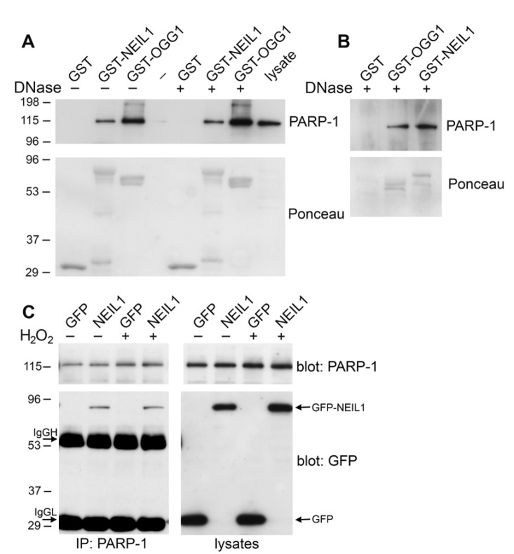 HeLa cells transfected with either pEGFP or pEGFP-NEIL1 were mock treated or treated with 500 μM H2O2 for 30 min. Immunoprecipitations were performed essentially as previously described [52] and PARP-1 was immunoprecipiated with anti-PARP-1 antibodies from Enzo Life Sciences (clone C-2-10). PARP-1 immunoprecipitates or lysates were probed with anti-GFP (Millipore) and anti-PARP-1 antibodies (Cell Signaling).