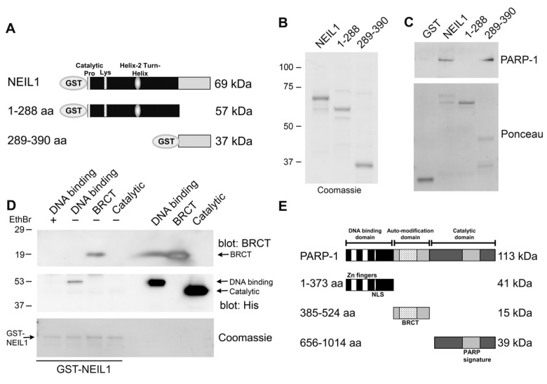 To gain further insight about this interaction, we purified two fragments of NEIL1 corresponding to the first 1–289 aa and the C-terminal 289–390 aa (Figure 2A,B). Colloidal Coomassie Blue staining of the polyacrylamide gel allowed visualization of the purified fragments (Figure 2B). PARP-1 bound to the C-terminal 289–390 aa of NEIL1 (Figure 2C) in the in vitro binding assay. Interestingly, other proteins including, WRN, FEN-1, PCNA, RPA, Rad9-Rad1-Hus1 complex, DNA polymerase β, and DNA ligase IIIα have also been shown to bind to NEIL1 in this region, suggesting that this domain may be important for mediating protein-protein interactions [19-24]. In addition, we examined whether two single nucleotide polymorphisms of NEIL1 in this region (R339Q, R334G) affected PARP-1 binding [15, 16]. However, both of these cancer-associated polymorphic variants retained the ability to bind to PARP-1 (data not shown). Additionally, we mapped the region of PARP-1 where NEIL1 binds (Figure 2D) by incubating GST-NEIL1 with either the DNA binding, BRCT or catalytic domains of PARP-1 (Figure 2E). We immunoblotted these GST-NEIL precipitations with either anti-His antibodies that recognize the DNA binding and catalytic domains or antibodies specific for the BRCT domain. NEIL1 bound to the BRCT domain of PARP-1, a region important for protein binding (Figure 2D). We also found that NEIL1 bound to the PARP-1 DNA binding domain, but this binding was abrogated by incubation with the DNA intercalator ethidium bromide, indicating that this interaction is mediated mainly through DNA. These data suggest that NEIL1 binds to PARP-1 through a protein-protein interaction with the BRCT domain of PARP-1.