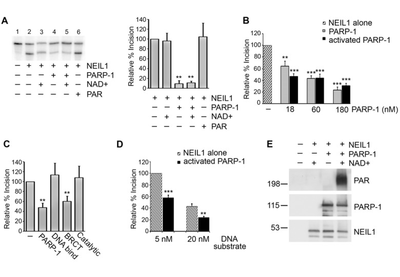 To ensure that PARP-1 is activated in the incision assays, we incubated NEIL1 and PARP-1 with or without NAD+ and then added the duplex oligonucleotide containing the 5-OHU lesion as in the incision assays. However, in these experiments the duplex 5-OHU substrate was not radiolabeled. After incubation, we separated the reactions on a poly-acrylamide gel and immunoblotted with anti-PAR antibodies to monitor PARP-1 activity (Figure 3E). Indeed, in the presence of NAD+, PARP-1 was substantially activated in the incision assays, indicating that the similar inhibitory actions of PARP-1 and activated PARP-1 on NEIL1 incision ability were not due to the fact that PARP-1 was not active in our experiments.