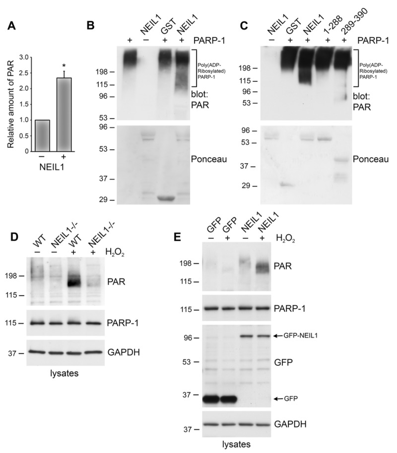To measure PARP-1 automodification, we incubated PARP-1-HSA (Trevigen; 7.5 ng) with GST-NEIL1, GST-NEIL1 1–288 aa, GST-NEIL1 289–390 aa or GST control (5 μg) for 10 min and then added PARP cocktail, activated DNA and buffer (Trevigen), incubated for 15 min and then the reactions were separated by SDS-PAGE. Reactions were probed by immunoblotting with anti-PAR antibodies (Trevigen) and membranes were stained with Ponceau S to visualize the fusion proteins.