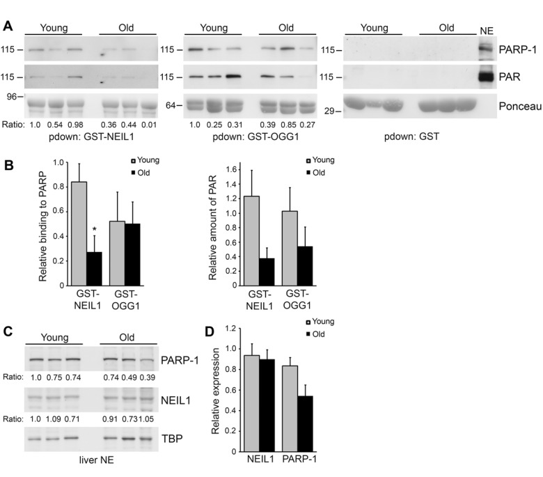Decreased binding of GST-NEIL1 to PARP-1 in older mice