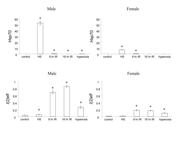 Comparison of the responses to the different stresses reveals preferential induction of certain genes. For example, Hsp70 (Figure 1) and Hsp22 (Supplemental Figure S3) were induced to the greatest extent by heat stress, whereas l(2)efl (Figure 1) and ade3 (Supplemental Figure S3) were induced to a greater extent by ionizing radiation and hyperoxia. In addition significant sexual dimorphism in the magnitude of responses was observed. For example, the induction of Hsp70 (Figure 1) and Hsp22 (Supplemental Figure S3) in response to heat stress was greater in males than in females, and the induction of l(2)efl (Figure 1) and ade3 (Supplemental Figure S3) in response to ionizing radiation was greater in males than in females.