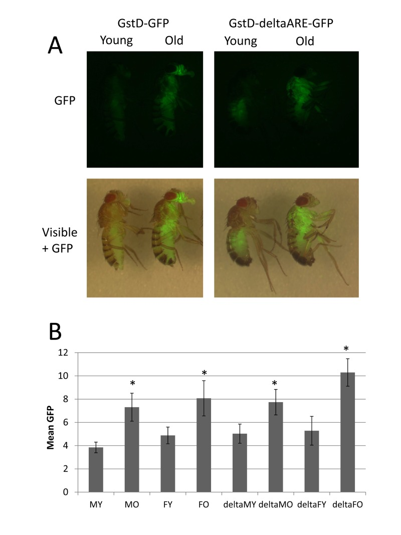 Here the expression of the GstD-GFP and GstD-deltaARE-GFP reporters were examined in whole adult flies during normal aging. The GstD-GFP reporter was expressed at low levels in young flies, and exhibited robust induction throughout the body of the fly during aging, including the head, thorax, abdomen and legs (Figure 2A), consistent with the whole-body micro-array analyses presented above. Induction was apparent even at moderate ages (30 days; Figure 2A) and continued at high levels for the remainder of the life span (data not shown). In contrast, the GstD-deltaARE-GFP reporter was robustly induced in thorax and legs, particularly in flight muscle and leg muscle, whereas induction in the head and abdomen was either greatly reduced or absent. The GstD-deltaARE-GFP reporter was also observed to produce slightly more expression in young flies in the upper abdomen. The mean GFP intensity throughout the body was quantified from captured images of multiple flies using Image J software, and this analysis confirmed the up-regulation of both reporters during aging, in both males and females (Figure 2B). Despite the absence of GFP induction in head and abdomen tissue, the mean intensity of fluorescence produced by the GstD-deltaARE-GFP reporter throughout the fly was comparable to the un-mutated reporter (Figure 2B), as the expression in thorax and legs was relatively greater (see Figure 2A); and this difference may be due to some effect of the different chromosomal insertion sites on the overall expression levels for the reporters. Taken together, these data confirm the up-regulation of the GstD1 gene during aging in the majority of adult tissues, and suggest that efficient expression in the head and abdomen may require the consensus ARE motif (Diagrammed in Supplemental Figure S4).