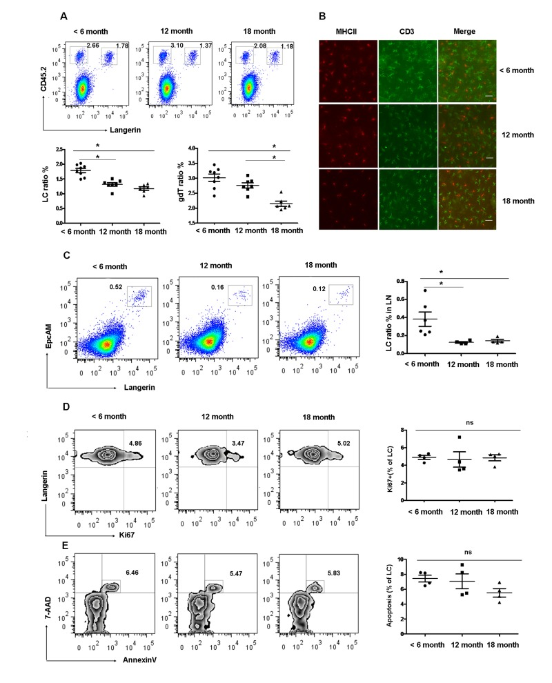 Whole body skin from young (< 6 months) and aged (>12 months) mice was floated on dispase (2.5mg/ml) for 50 min in a 37°C incubator. The epidermis was separated and then digested with typsin (0.05%) and Dnase (0.1mg/ml) for 15 min in a shaking bath. Cells were filtered through a 70μm strainer to obtain single cell suspensions. Single-cell suspensions were incubated with anti-FcγRII/III (clone 2.4G2) and stained for surface and intracellular markers with the following antibodies: I-A/E(M5/114.15.2), CD45.2 (104), CD80 (16-10A1), CD86 (GL1), CD3e (145-2C11), CD4 (GK1.5), CD8 (53-6.7), EpCAM (G8.8), and Langerin (929F3.01) (purchased from eBioscience or Dendritics). Data were analyzed with a FACSAria™II (BD Bioscience) and Flowjo software. Apoptosis and proliferation assays were carried out by staining with Annexin V, 7-AAD (BD Bioscience) and Ki67 (SolA15) according to the manufacturer's instructions.