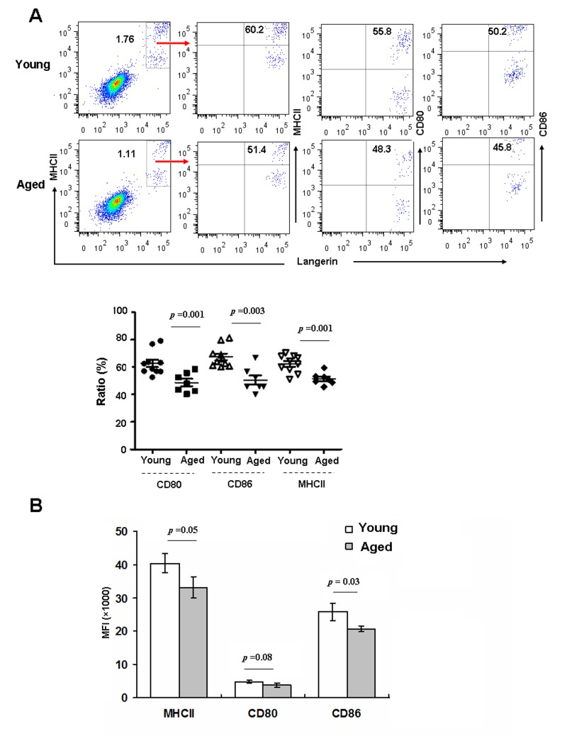The initiation, execution, and sustainment of T cell immunity by DCs require cell-cell contact mediated by costimulatory molecules on the DCs [23]. Immature LCs in the epidermis mature in response to various stimuli, and then migrate to draining LNs to prime T cells [24]. Hence, we investigated whether aging can affect epidermal LCs maturation in vitro. Epidermal cells derived from aged and young mice were cultured for 48h in vitro, and then stained with anti-CD80, CD86 and MHC-II, and assessed by FACS. As shown in Fig 2, the frequencies of these maturation markers were reduced on aged LCs (Figure 2 A), and expression levels of CD86 and MHCII based on MFI were also reduced (Figure 2 B). Thus, aged LCs have a lower ability to up-regulate MHCII and co-stimulatory molecules upon in vitro maturation.