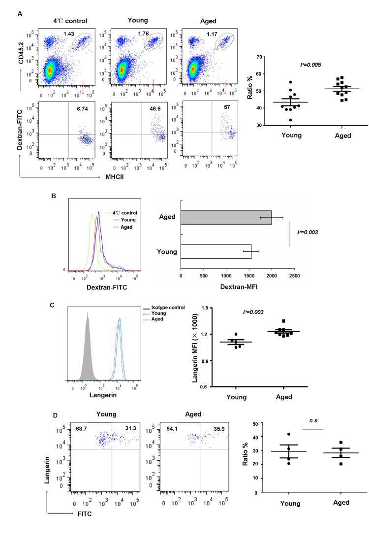 There are many reports suggesting that different cellular components of the innate immune system such as neutrophils, natural killer (NK) cells, NKT, and macrophages, which are all important first lines of defense against bacterial and parasitic infections, are defective in aged mice and human [3-5]. DCs are professional antigen-presenting cells (APCs) that are important in the initial priming of naïve T cells and act as a bridge to link innate immunity and adaptive immunity. Several studies indicate that the number of DCs does not change with age [6, 7]. However, Schodel et al. found a decrease in circulating plasmocytoid DCs numbers but observed no change in the number of myloid DCs [8]. There is also some controversy regarding the capacity of aged DCs to stimulated T cells [8, 9]. Epidermal LCs are skin-resident DCs with a life cycle distinct from other types of DCs. They play a key role in the development of cutaneous immune responses. Previous studies have speculated that age-related changes in epidermal LCs frequency and/or migration patterns results in impaired immunosurveillance in human [10]. However, the precise effects of aging on LCs are still not well understood.