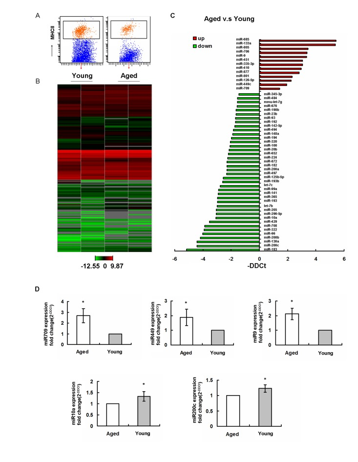 A recent study showed that deletion of miRNA precursor-processing enzyme Dicer in DC precursors interrupted the homeostasis and function of LCs. This suggested a key role of miRNAs in LC development and function [15]. Interestingly, miRNAs have also been shown to regulate the aging processes in different tissue and cells [31]. To test if the miRNAs are potentially involved in aged LCs development and function, the global miRNA expression profiles of sorted LCs from aged and young mice (Figure 5 A) were performed by TaqMan qPCR-based arrays (Figure 5 B). Using global normalization [32], we have identified 53 age-regulated miRNAs in LCs (fold change > 3), including 40 downregulated miRNAs and 13 upregulated miRNAs (Figure 5 C). Based on the miRNAs potentially linked to LCs development and function, we have further confirmed that miR-709, miR-449 and miR-9 were upregualated in aging, while miR-200c and miR-10a were downregulated in aging by using single TaqMan RT-PCR assays (Figure 5 D).