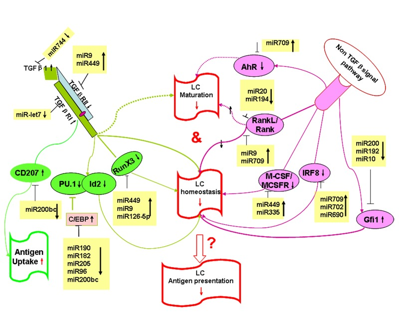 | miR744↓ | TGFβI | inhibit LC maturation | 32,46 |