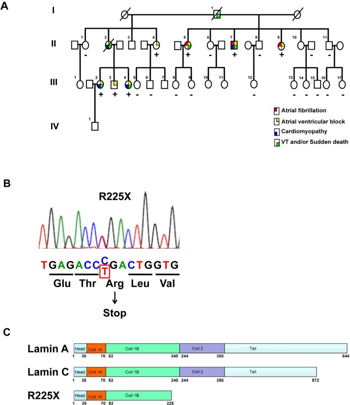 (A) The pedigree of the proband (Patient II-7) with cardiac laminopathy featuring atrial fibrillation, atrioventricular block, dilated cardiomyopathy, ventricular tachyarrhythmia and sudden cardiac death. Four-generation family had 9 affected members showing autosomal-dominant cardiac disease. (See also table 1)(Square = male; circle = female; slash = deceased). A nonsense LMNA mutation (R225X) segregates with atrial fibrillation, atrioventricular block, dilated cardiomyopathy and ventricular tachyarrhythmia (“+” = LMNAR225X/WT, “-” = LMNAWT/WT). (B) The sequence chromatogram of the mutant allele of LMNA. The mutation altering amino acid sequence (in red) predicts a premature stop codon. (C) The schematic of lamin A/C proteins. Alternative splicing results at 572 and 664 amino acid lamin C and lamin A proteins. The R225X mutation results in a premature stop codon in the α-helical rod domain, thus a truncated lamin protein.