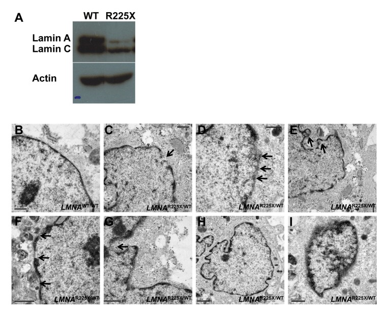 We have established primary cultures of dermal fibroblasts from the proband (II-7) harboring the heterozygous R225X LMNA mutation and from a control individual (Figure 1). Compared with control dermal fibroblasts, LMNAR225X/WT dermal fibroblasts had reduced expression of the lamin A/C proteins (Figure 2A). Ultra-structural analysis using electronic microscopy revealed dramatic morphological alterations suggestive of nuclear senescence in LMNAR225X/WT dermal fibroblasts including focal loss of nuclear membrane, clustering of nuclear pores, large aggregates of highly condensed heterochromatin, bleb and micronucleus formation, and accumulation of mitochondria around the nuclear envelope (Figure 2B-I). Although these dysmorphic features of nuclear senescence, commonly seen in aging cells [26], could also be observed in the control fibroblasts with immunofluorescence analysis, they occurred in lower frequency (3.6 ± 3.6%, vs. 18.0 ± 1.8%, P<0.05) with less-severe morphological abnormalities in comparison with LMNAR225X/WT dermal fibroblasts (Figure 3A-E).