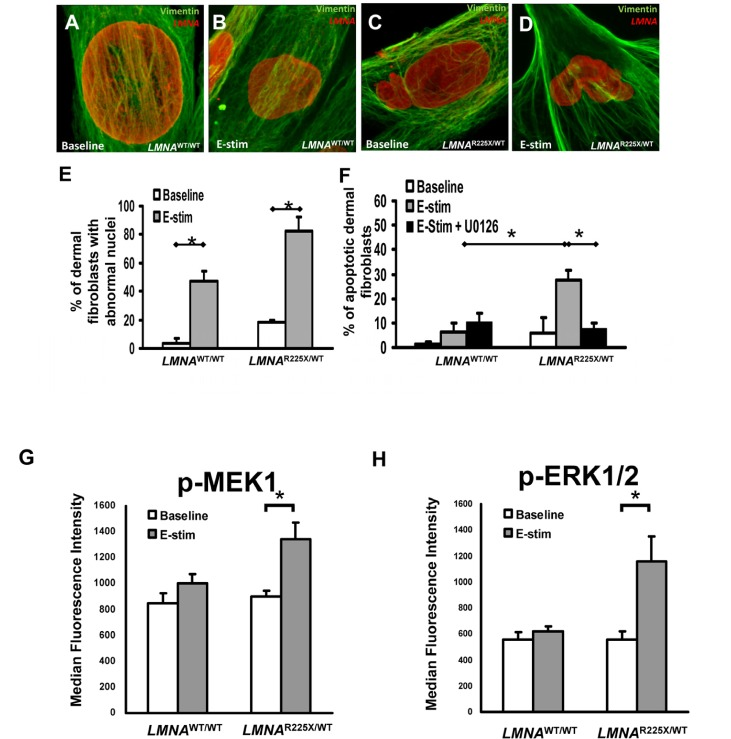 In this study, we first demonstrated that primary dermal fibroblast from patients with nonsense LMNAR225X/WT mutation had reduced expression of the lamin A/C protein and exhibited prominent nuclear senescence as observed in aging cells. When LMNAR225X/WT dermal fibroblast exposed to external stimuli with electrical stimulation, markedly increased in the percentage of cells with nuclear senescence as well as apoptosis were observed as compared with control dermal fibroblast. These findings suggest that LMNAR225X/WT somatic cells have increased susceptibility to nuclear senescence and apoptosis after exposure to external physical stress. Furthermore, our pre-screening results showed that activation of stress response pathway with MEK1 contribute to increase apoptosis of LMNAR225X/WT dermal fibroblast after electrical stimulation.
