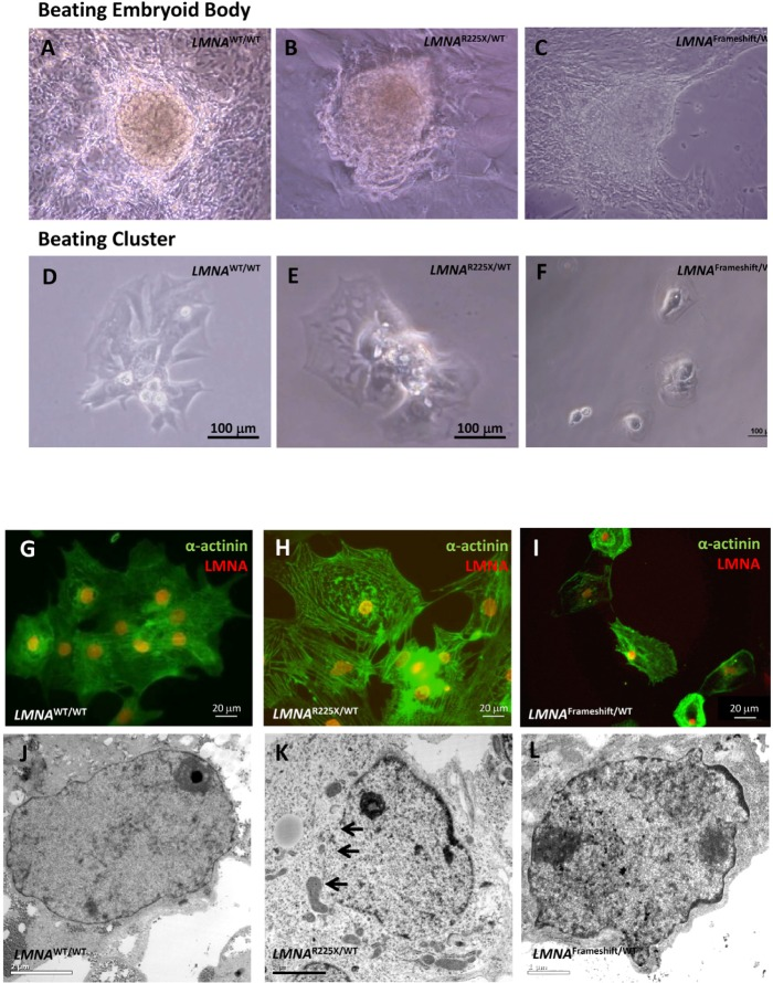 After cardiac differentiation, spontaneously beating outgrowths appeared approximately 14 to 21 days in embryoid bodies from both LMNAR225X/WT, LMNAFrameshift/WT and control iPSC lines (Figure 4A-C and Supplementary video I-III). The beating outgrowths were micro-surgically dissected out from the EBs and were dissociated into single cell clusters (Figure 4D-F, and Supplementary video IV-VI). Immunofluorescence analysis revealed the typical pattern of a cardiac-specific protein, α-actinin in beating cells from both LMNAR225X/WT, LMNAFrameshift/WT and control iPSC lines, confirming their cardiac identity (Figure 4G-I). Morphologically, there were no observable difference between the cardiomyocytes derived from the three iPSC lines, except the more prominent nuclear alterations of nuclei in LMNAR225X/WT andLMNAFrameshift/WT iPSC-CMs (Figure 4J-L).