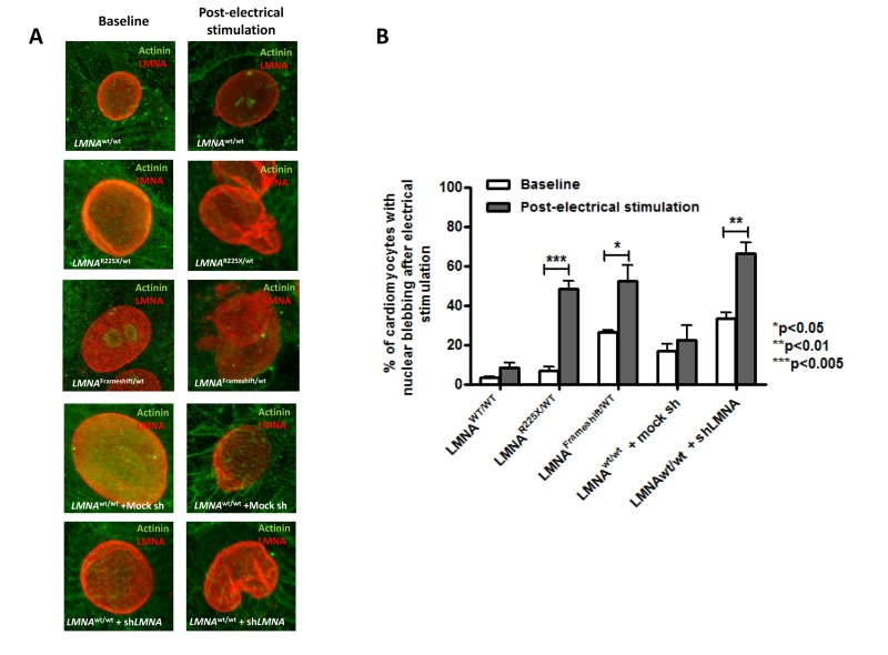 To further verify whether lamin insufficiency contributes to the enhanced susceptibility of cardio-myocytes to electrical stimulation, we altered the expression of LMNA in control hiPSC-CMs by shRNA-mediated down-regulation (~60% as revealed by western blotting by probing of N-terminal LMNA A/C antibodies, data not shown). shRNA-treated control iPSC-CMs exhibited significantly higher percentage of nuclear senescence at baseline and after electrical stimulation (p<0.05) (Figure 5B). Likewise, shRNA mediated down-regulation of LMNA resulted in a significantly higher percentage of apoptotic cells than in control iPSC-CMs after electric stimulation (Figure 6E).