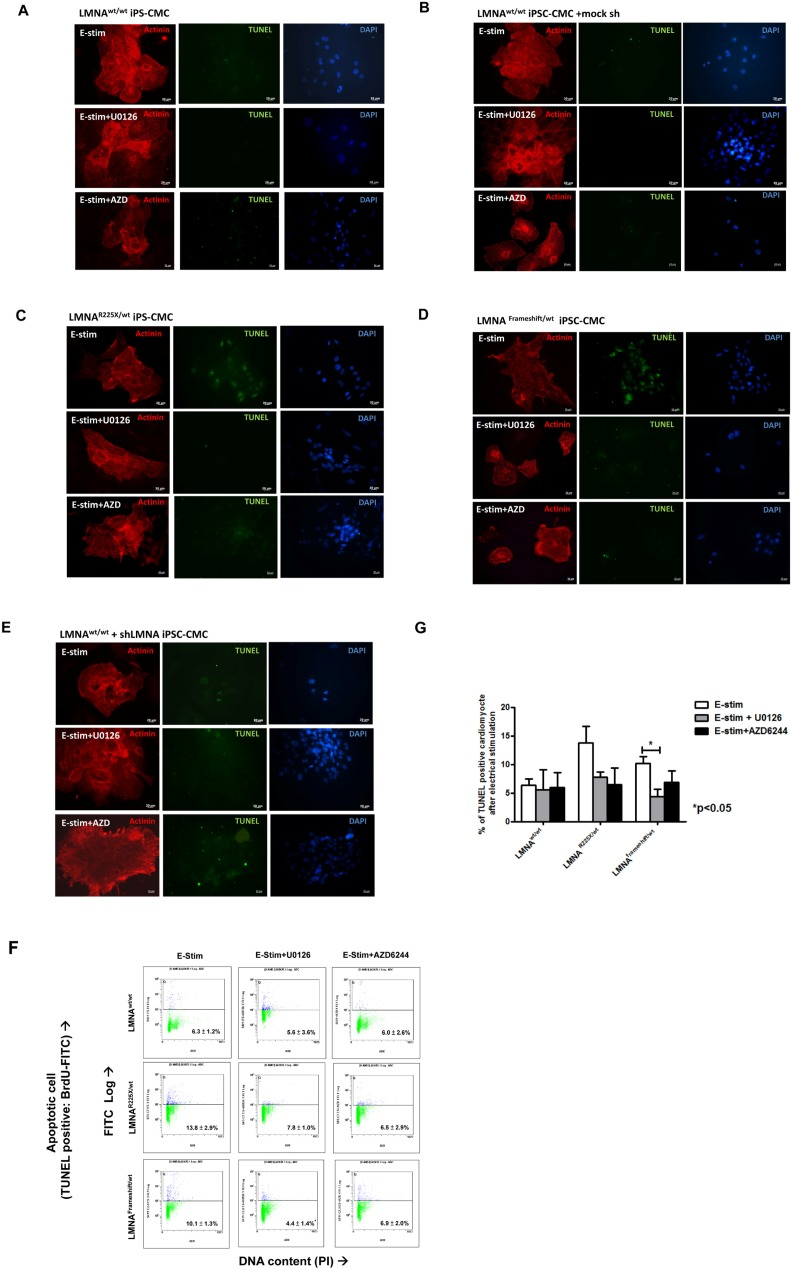 Next, we generated disease-specific iPSC lines from the proband with LMNAR225X/WT and differentiated them together with another LMNA haploinsufficiency line, LMNAFrameshift/WT into cardiomyocytes. Interestingly, LMNAR225X/WT and LMNAFrameshift/WT iPSC-CMs showed normal phenotypes without significant nuclear abnormalities and electrophysiological properties at baseline as control iPSC-CMs. However, when these cardiomyocytes were subjected to electrical stimulation to mimic theirin-vivo host environment, they exhibited typical nuclear abnormalities resembling previous pathological findings from explanted human cardiomyocytes from individuals with LMNA-related DCM [28]. Furthermore, electrical stimulation significantly increased cellular apoptosis of LMNA haploinsufficiency iPSC-CMs, but not in control iPSC-CMs. The biological relevance of lamin A/C protein in cardiomyocytes was further verified by in-vitro knock-down of LMNA with adenoviral transient expression shRNA in control iPSC-CMs. Indeed, shRNA treated control iPSC-CMs mimicked the phenotypes changes as well as the susceptibility to apoptosis after electrical stimulation as LMNAR225X/WT and LMNAFrameshift/WT iPSC-CMs. More importantly, the increased susceptibility of apoptosis with electrical stimulation in the shRNA treated control- and the mutated LMNA iPSC-CMs could be attenuated or even completely abolished by pharmacological blockade of the MEK1/ERK1/2 pathway.