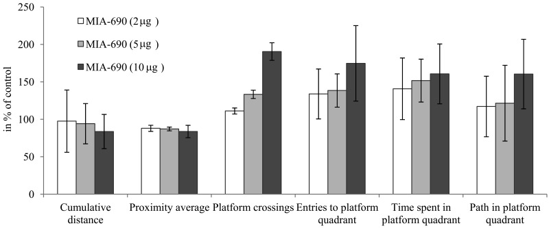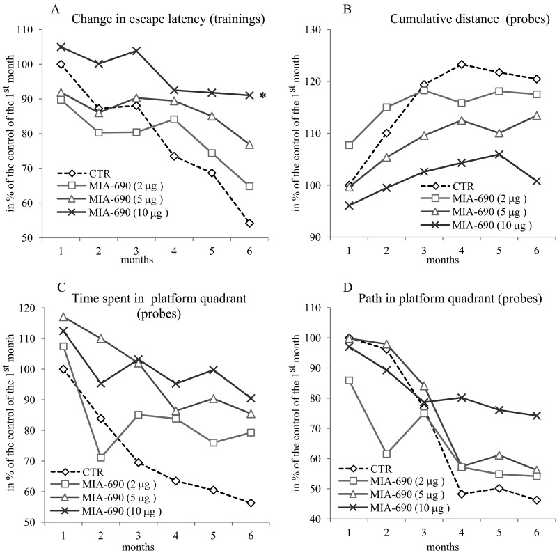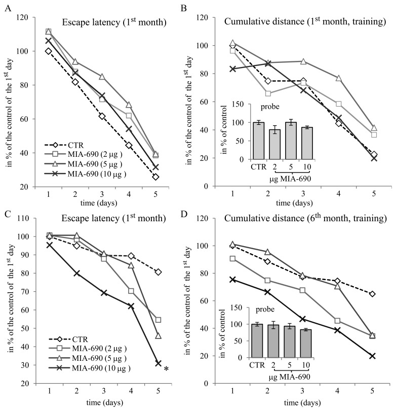Transgenic mice (5XFAD strain) were obtained from The Jackson Laboratories (Bar Harbor, ME). The animals were housed in sterile cages in a temperature-controlled room with a 12-h light/12-h dark schedule and were fed with autoclaved chow and water, ad libitum. Both sexes were used, evenly distributed between the different treatment groups. For the Morris water maze experiments 41 adult mice (approximately 3 months old) were used and were divided into 4 treatment groups, each of which received the following subcutaneous daily treatment for 6 months: group 1: (control), vehicle solution; group 2: MIA-690 (2 μg); group 3: MIA-690 (5 μg); and group 4: MIA-690 (10 μg).