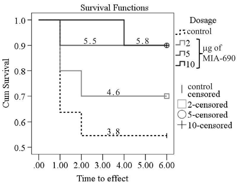 Our previous publications have already demonstrated that different classes of hypothalamic neurohormone analogs could influence CNS functions. For example, the LHRH antagonist, cetrorelix, facilitated memory and had anxiolytic and antidepressive actions in mice [6] and rats [9] exposed to the neurotoxic effects of an amyloid-β fragment (amyloid-β25-35). In a similar fashion, the GHRH antagonist, MZ-4-71, improved memory consolidation in passive avoidance learning [7, 10], decreased anxiety [7, 35], and proved to be antidepressive [7, 36], in CFLP mice treated with amyloid-β25-35. In a different model of cognitive decline, the treatment of senescence accelerated mice (SAMP8) with another GHRH antagonist (MZ-5-156) also enhanced cognitive functions [11]. The GHRH antagonist treatment produced significantly better performance in active avoidance T-maze, step-down passive avoidance and object recognition. Also, the peptide improved pole balance and increased survival and telomerase activity. These findings are in complete agreement with our studies, as MIA-690 treatment also showed a tendency to prolong survival (Fig. 4).