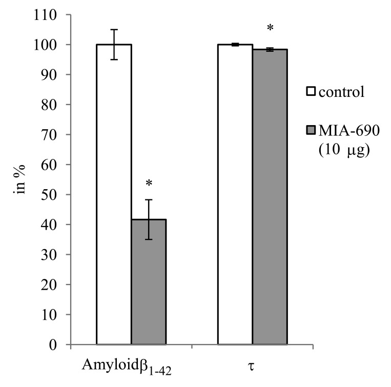 Similar changes are observed in the expression of the microtubule-associated proteins (MAP)s. Both MAP2 and MAPτ were down-regulated. The final markers of these genomic changes (amyloid-β1-42 and total τ levels) were verified by proteomic determination. The amyloid-β1-42 level showed especially dramatic decrease due to MIA-690 treatment (Fig. 5), which finding suggests that further studies are needed and should include the selective measurement of hyperphosphorylated as opposed to total τ levels. This also confirms that the relationship between amyloid-β1-42 raft formation and τ-based neurofibrillary tangle formation is not direct but is a highly unpredictable and cross-related process of the deranged axonal transport [40]. The importance of hyperphosphorylation is accentuated by the marked down-regulation of cyclin-dependent kinase 1 (CDK)1. CDKs belong to those “culprits”, which take part in the post-translational modifications of the MAPs [41], and catalyze, with phosphorylation, the misfolding of τ fibrils.