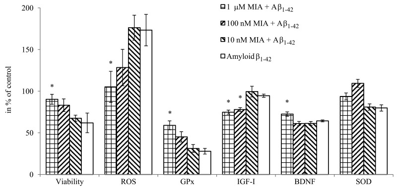 Investigations, in vitro, followed, in general the descriptions in the literature, with slight modifications [60]. Briefly, HCN-2 cells (American Type Culture Collection, Manassas, Virginia, USA) were cultured in DMEM medium (supplemented with 10% Fetal Bovine Serum (FBS) and 0.1% penicillin/streptomycin) at 37°C and in an atmosphere of air and 5% CO2. At 70-80 percent of confluency, the cultures were trypsinized and resuspended in fresh serum-containing medium and either transferred into T-75 flasks or directly plated into 48- well micro plates at 10,000 cells/cm2. The next day, the differentiation of HCN-2 cells was induced by adding fresh medium containing 25 ng/ml NGF, 0.5 mM dibutyryl cAMP and 0.1 mM isobutylmethylxanthine (IBMX) (all from Sigma-Aldrich, St. Louis, MO) for a week. Then, human amyloid-β1-42 (Abbiotec LLc, San Diego, CA)stock solution (10 mM) was prepared in DMSO and then immediately diluted to appropriate concentrations in the assay medium. The medium used for neurotoxicity assay was N2-supplemented DMEM/F12 (Gibco BRL, NY) with 10% FBS. The treatment groups were control, amyloid-β1-42, and the combination treatments with amyloid-β1-42 and the 3 doses (10 nM, 100 nM and 1 μM) of MIA-690; controls received propylene glycol and DMSO containing medium. The effect of the analog on proteo-toxicity was evaluated after three days of exposure. The viability of the cells was determined by using the 3-(4,5-Dimethylthiazol-2-yl)-2,5-diphenyltetrazolium bromide (MTT) assay (Cell Titer 96® Non-Radioactive Cell Proliferation Assay, Promega, Madison, WI), according to the manufacturer's instructions [61]. APF assay (Invitrogen) was used for the detection of free radical formation according to the manufacturer's instructions. Concentrations of the specific proteins (IGF-I, IGF-II, GPx1, SOD1, BDNF) in the media were determined using appropriate ELISA kits according to the manufacturer's instructions. IGF-I, IGF-II and BDNF human ELISA kits were obtained from AbCam Inc. (Cambridge, MA) while GPx1 and SOD1 kits from Abfrontier through Biovendor, LLC, (Candler, NC). Readings were normalized to protein concentrations as determined by NanoDrop (NanoDrop Technologies Inc., Wilmington, DE).
