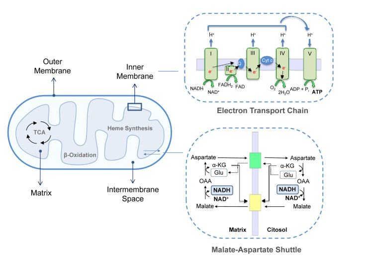The MOM is smooth and widely permeable to ions and molecules of up to 10KDa. Proteins localized in the MOM are mainly involved in solute exchange, protein import and fatty acid uptake for β-oxidation. Conversely, the MIM is impermeable to most solutes and ions, a property that allows complexes of the ETC to build up the proton gradient required for oxidative phosphorylation. Consequently, specific carriers exist to transport individual molecules across this barrier. Common to all mitochondria are the ADP/ATP carrier, which exports ATP into the cytoplasm while ADP is imported into the matrix, the phosphate transporter and the pyruvate carrier. Other systems transport citric acid cycle intermediates that are used by cells in cytosolic pathways such as fatty acid synthesis and gluconeogenesis. For example, di- and tricarboxylate carriers exchange malate or succinate for HPO42− and citrate and isocitrate for malate, respectively. Since fatty acid β-oxidation occurs in the mitochondrial matrix, long-chain fatty acids are actively transported from the cytoplasm into the mitochondria by the carnitine palmitoyl transferase system of the MIM [5, 6]. Moreover, the MIM contains several transport shuttles used to transport the reducing agents NAD(P)(H) and FAD(H2) across the membrane. An example is the malate-aspartate shuttle in which the electrons of NADH are given to oxaloacetate forming malate after which malate is transported across the inner membrane and reoxidized back to oxaloacetate by malate dehydrogenase converting NAD+ to NADH in the mitochondrial matrix (Figure 1).
