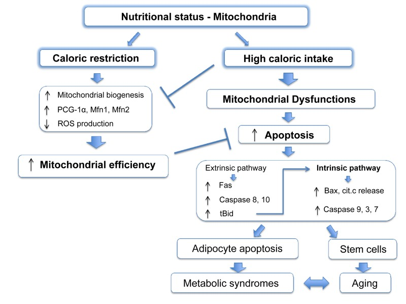 In summary, the nutritional imbalance in western diets leads to mitochondrial dysfunction and higher susceptibility to apoptosis with dramatic consequences for metabolic syndromes such as insulin resistance and liver steatosis (Figure 2). It is already known that caloric restriction protects from several stresses [74], and it would be interesting to investigate whether cells isolated from mice on different diets show different susceptibilities to apoptotic cell death via the intrinsic pathway and whether this correlates with the mitochondrial respiratory rate. In particular, adult stem cells could be intriguing candidates for further studies, as they show a particular sensitivity to nutrient availability, and their loss contributes to aging [88-90]. Increased nutrient-mediated susceptibility to cell death may cause stem cell repertoire exhaustion and accelerate aging in obese individuals in a mitochondria-dependent fashion, at least partially explaining the increased apoptotic rates in aged individuals [91-93].