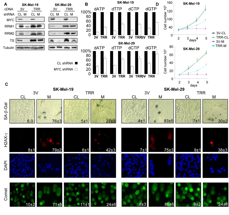 Based on the above data, we hypothesized that senescence in MYC-depleted cells was induced by low expression of TS, RRM1 and RRM2 that led to decreased amounts of intracellular dNTPs and subsequently to DNA damage. To test this hypothesis, we concurrently infected SK-Mel-19 and SK-Mel-29 cells with lentiviral vectors containing cDNAs for TS, RRM1 and RRM2 (TRR) or with three empty vectors (3V). 48 hours post-infection, cells were super-infected with control or C-MYC shRNA-expressing viruses. As shown in Figure 2AB, levels of TS, RRM1 and RRM2 proteins as well as the amounts of dNTP pools were significantly higher in C-MYC-depleted TRR-cells than in 3V cells. Similarly, other senescence-associated phenotypes, including DNA damage, activity of SA-β-Gal and proliferation arrest were substantially less pronounced in TRR-MYC than in 3V-MYC populations of cells (Figure 2CD). Therefore, co-expression of TS, RRM1 and RRM2 in melanoma cells partially overcomes senescence caused by C-MYC depletion.