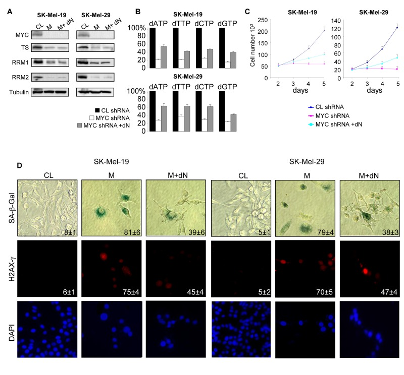 Taken together, our data indicate that depletion of dNTPs is one of the major causes of DNA damage and senescence in MYC-depleted melanoma cells and that maintaining high TS, RRM1 and RRM2 levels is important for C-MYC-dependent suppression of senescence programs in these cells.
