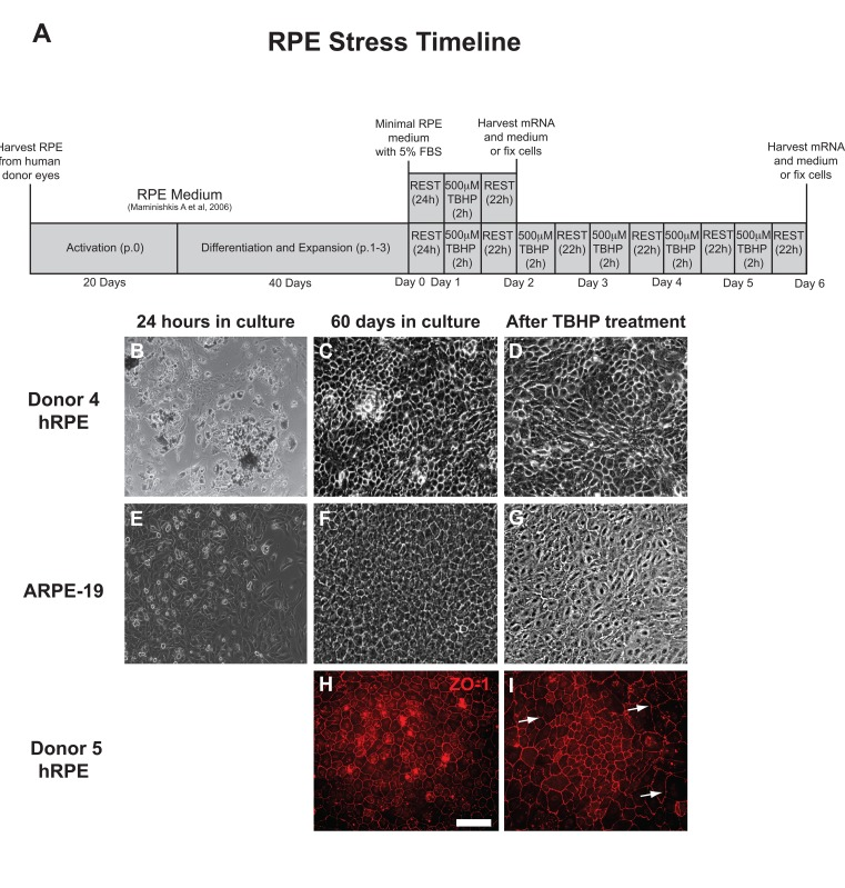 The experimental approach is presented as a diagram (Fig. 1A). hRPE cells were isolated and then plated into 24-well plates (Fig. 1B). The sub-population of RPESCs was activated to self-renew, dividing approximately once per day [34]. The resulting cultures were differentiated by lowering the serum concentration to produce a confluent culture of cells with the cobblestone epithelial morphology of mature hRPE (Fig. 1C) that exhibited a TER measurement of 200-250Ω ·cm2. The total time from initial donor harvest to the initiation of a stress experiment was 60 days (Fig. 1A). ARPE-19 cells were cultured in the same conditions as donor-derived hRPESCs and produced monolayers that closely resembled the cobblestone morphology of hRPE cells (Fig. 1E, F).