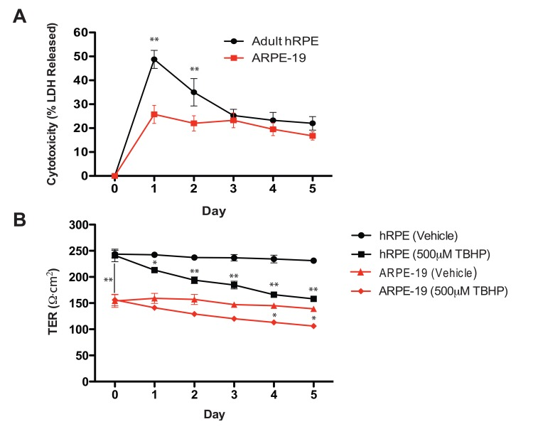 As a measure of integrity of the hRPE and ARPE-19 cell monolayers, we measured the TER daily, immediately prior to the next TBHP exposure. Substantial resistances (200-250Ω·cm2) such as those generated by the hRPE in this system are consistent with the generation of tight junctions [45], as is the observation of ZO-1 immunoreactivity (Fig.1H). Similar significant decreases in TER (Student's t-test, *, p<0.05, **, p<0.01) were observed in hRPE and ARPE-19 cells over the 5-day treatment period (Fig. 2B).