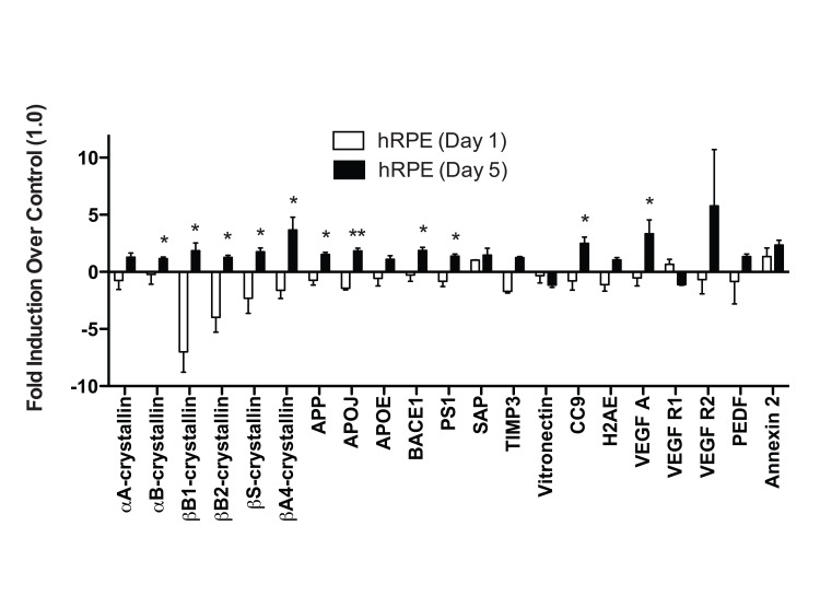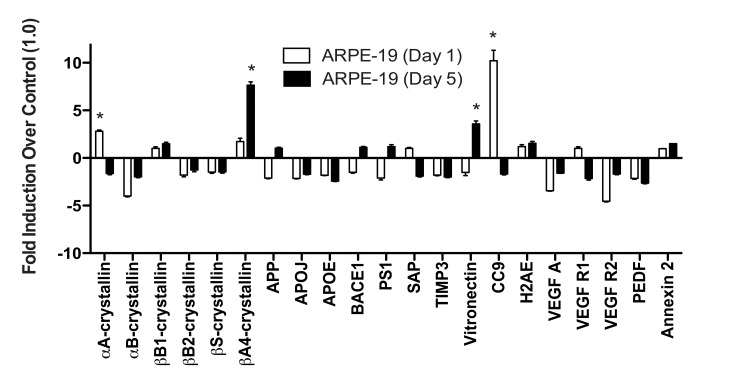 When ARPE-19 cells were exposed to TBHP for 1 day, we detected only marginal differences in the drusen-related transcript expression profile (Fig. 5). αA-crystallin and CC9 were significantly upregulated compared to vehicle-treated controls 22 hours following this initial TBHP exposure (Student's t-test, *, p<0.05). However, both of these markers decreased to below control levels after 5 days of treatment (Fig. 5). Only βA4-crystallin and Vitronectin were significantly upregulated by the ARPE-19 compared to vehicle-treated controls after 5 days of TBHP treatment (Student's t-test, *, p<0.05). In contrast to the hRPE, the total expression response profile (Appendix A) of the ARPE-19 was not found to differ significantly between 1 and 5 days by two-way ANOVA (p=0.9161).